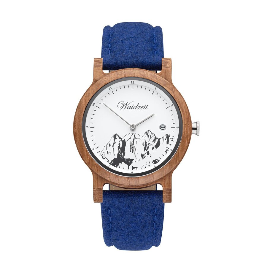 Erhältlich mit hellem Ziffernblatt und blauem Lodenarmband oder mit dunklem Ziffernblatt und grünem Armband. Ein graues Lodenarmband aus feinster Merinowolle von der Lodenmanufaktur "Steiner 1888" ist bei beiden Varianten inklusive und einfach wechselbar.